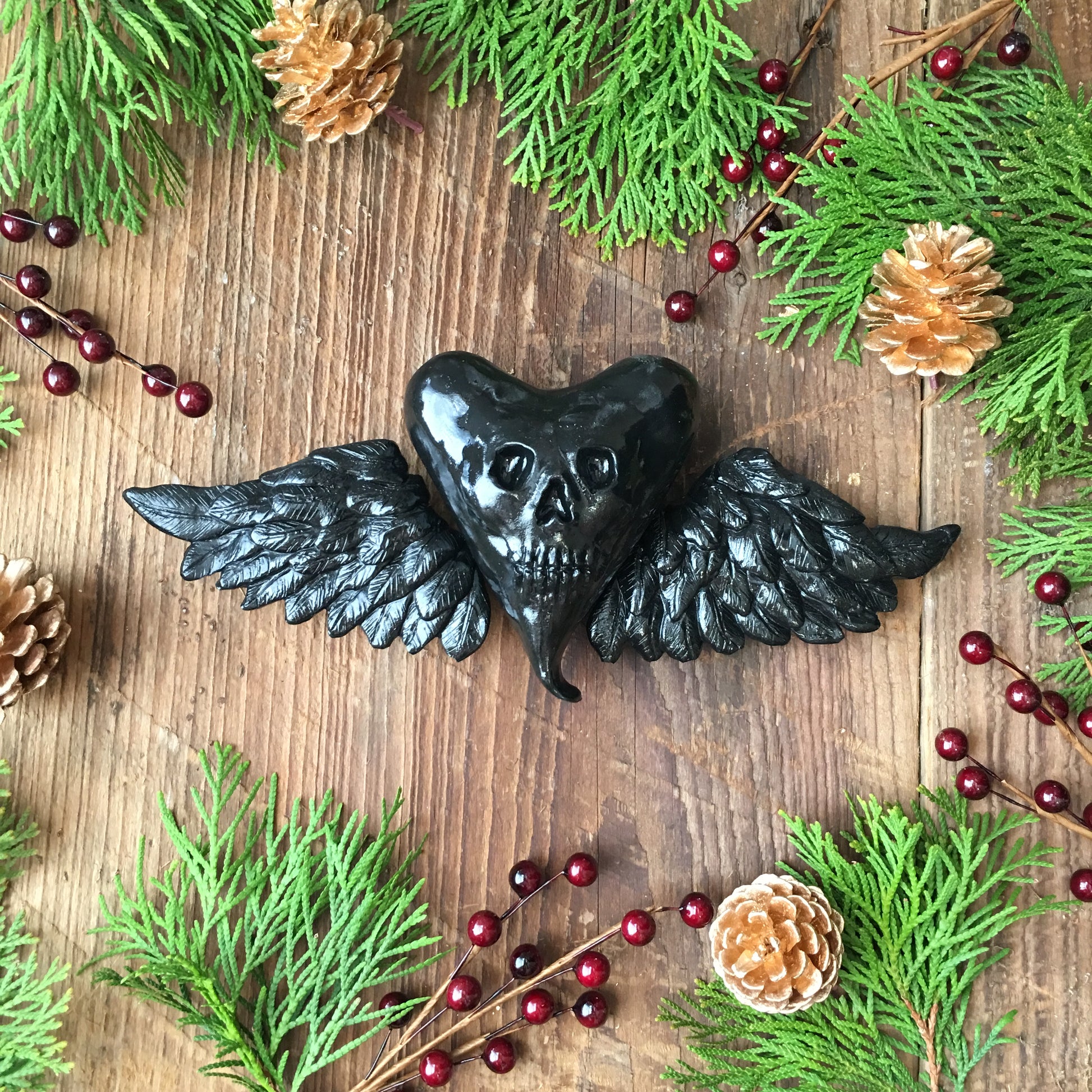 each heart with wings is hand sculpted molded then cast with Rockite© (Rockite Cement is a fast setting, hydraulic-type cement compound of more than twice the strength of fully cured conventional concrete. When mixed with water to a pourable consistency) and colored with spray paint.